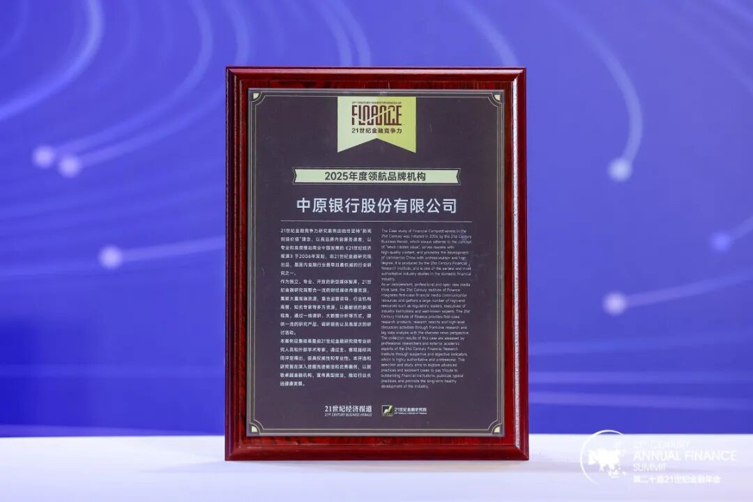 11月22日,在《21世纪经济报道》主办的“第二十届21世纪金融年会”上,2025年21世纪金融竞争力研究案例正式揭晓。中原银行获“2025年度领航城商行”“2025年度领航品牌机构”两项荣誉称号。